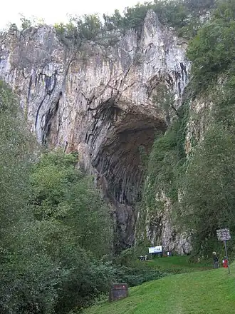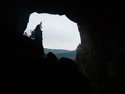 A prominent feature on the mountain is the cave Potpećka pećina (43°47′44″N 19°55′59″E / 43.79556°N 19.93306°E / 43.79556; 19.93306), located near the village of Potpeće. Its main entrance, 72 m (236 ft) tall, is the largest of all caves in the Balkans. Seen from the inside, the main entrance resembles the shape of the mammoth. Apart from the main, upper entrance for tourists, there is a smaller, lower entrance into an underground lake, which overflows in rainy seasons, creating an intermittent water flow called Petnica, flowing into Đetinja river. It is just over 1 km (0.62 mi) long. The cave's upper hall has lightened tourist trail, 555 m (1,821 ft) long, reachable by a circular staircase of 750 stairs. The "dry" hall contains stalactites and stalagmites, while the "wet" section is still geologically active, and is protected from outer atmosphere by an iron gate. It keeps the constant temperature of 9 °C (48 °F), with high humidity. Largest hall in the still active section is called Cvijić's Hall, after the geographer Jovan Cvijić. A rare form of speleothems, helictites, developed in the cave. The speleothems are given jocular names: Single guy, Uncle Ljuba and his cats, Eagle on the rock, Snow White and the seven dwarfs. The cave is protected as the natural monument.[3][4][5]