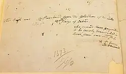 Upon Jones's passing his collection was sold at auction in 1825. In the auction catalog of Jones's library, this volume is identified as lot 452.[7][4] Musicologist Robert Klakowich hypothesized that it could have been purchased from the Jones's auction by Edward Francis Rimbault's father, Stephen Francis Rimbault (1773–1837).[8] Holman was able to examine Sotheby's copy of the catalogue which contained the names of the buyers. The buyer for this manuscript is identified only as "Palmer" who purchased this volume along with Locke's Cupid and Death and a score for Macbeth (formerly thought to be composed by Locke but now attributed to Richard Leveridge) for four shillings.