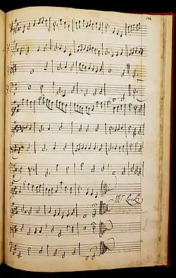 Almost all the music in Drexel 3976 is scored for four parts using treble, alto, tenor and bass clefs.[14] Based on a contemporary document, Holman explained that this scoring would result in six violins, six countertenors, six tenors and six basses. The rationale for this is that scoring for a single violin, two violas and bass is commonly found in seventeenth-century dance music, particularly in the courts of France, Sweden as well as German and Austrian courts.[15] More importantly, this was the scoring used by the violin band of the English court known as the Twenty-Four Violins. Holman surmised that the manuscript was probably derived from the repertory of the Twenty-Four Violins who played both theatrical and non-theatrical music.[14] Although Holman could not say exactly when chamber music shifted from having two violas to having two violins, he observed that the four works in Drexel 3976 that also appear in The Broken Consort have two violins and a single viola, indicating that the transition had begun to take place. (Similar works by Henry Purcell, Locke's successor at court, are primarily for two violins and viola, indicating the transition was nearly completed.)[16]