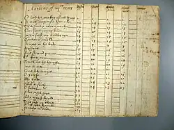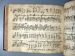 Music for voices and viols play only minor importance in the partbooks which could be taken as a sign of the difference between musical life in urban London (where the consort song has greater prevalence in existing sources) and that in provincial Gloucester.[24] The most significant composer of the consort song in the collection is Byrd; the collection contains 4 works from published sources as well as two unpublished songs.[25][26] The two unpublished songs by Byrd are"Come pretty babe" (the manuscript contains an attribution to Byrd) and "Delight is dead." Of the three consort songs ("Abradad," "Farewell the bliss" and "Come, Charon, come"), the latter two have no composer attributions.[25] Viewed as a whole, Merro's solo consort song repertory appears retrospective and antiquated (Monson calls it "ancient").[25] The partbooks contain no evidence of newer compositional approaches such as the lute ayre.[25]