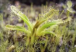 The leaves of D. arcturi are linear, 1–5 cm long, undivided, and range in colour from pale green to muddy brown, to maroon if subjected to full sunlight. Like all other species of Drosera, D. arcturi catches insects using sticky, glandular hairs on its leaves. In D. arcturi, these glandular hairs are red. Young leaves begin at the center of the plant and are folded along their center. Once the young leaf reaches full maturity it unfolds like a book.[3]