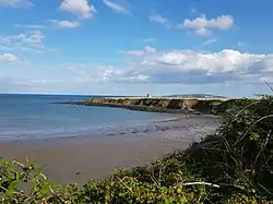The area consists of a small peninsula of about 40 acres, defended across the neck of the headland by three parallel earth banks running some 350 metres, north–south and fairly straight, with ditches in front of them. With the cliffs around the other sides this gives a strong defensive position. It is possible that the earthworks are Bronze Age, as are the somewhat similar ones at Knock Dhu, County Antrim, or they may be Iron Age. They are in character with other Irish forts, including a number in the area.[6] Within the ditches the headland is roughly rectangular, narrowing somewhat towards the sea, with the maximum distance from the ditches to the cliff not much more than 400 m. The Martello Tower is near the tip of the headland, about equidistant from the two sides.[7]