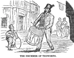 Early accounts reported that in 1661 a local landowner, John Mompesson, owner of a house in the town of Tedworth (now called Tidworth, in Wiltshire), had brought a lawsuit against an unlicensed vagrant drummer William Drury, whom he accused of collecting money by false pretences. After he had won judgment against the drummer, the drum was turned over to Mompesson by the local bailiff. Mompesson then found his house plagued by nocturnal drumming noises. It was alleged that the drummer had brought these plagues of noise upon Mompesson's head by witchcraft.[2] Drury was said to have been associated with a band of gypsies.