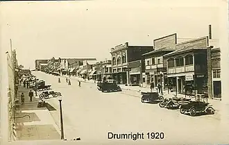 The Drumright "Oilers" nickname corresponds to local industry and history, as the discovery of oil led to the creation of the city. In 1912, oil was discovered just one-mile north of today's Drumright city limits and drilling began on the Cushing-Drumright Oil Field. By 1919, the Cushing-Drumright Field production site was thirty-two square miles, with a peak of 3,090 total oil wells.[2] The site was discovered by wildcatter Tom Slick, who struck oil on the farm of Frank Wheeler. The discovery of oil led to rapid growth in the yet to be named city of Drumright beginning immediately in 1912. A post office was quickly established on December 28, 1912. Local leaders James Fulkerson and Aaron Drumright platted the original city, which was initially called "Fulkerson." The town was then renamed for Aaron Drumright, whose farm was part of the town location. By the 1920 census, the newly formed city had over 6,000 residents.[3] The Drumright Gasoline Plant No. 2 was listed on the National Register of Historic Places in 1982.[4]