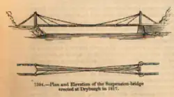 The bridge had been commissioned by David Stewart Erskine, 11th Earl of Buchan, an eccentric Scottish aristocrat who died in Dryburgh. It was 79 metres (259 ft) long. At the time, the cable-stayed type of bridge was rapidly becoming more popular. The Earl opened the completed bridge on 1 August 1817, but in January 1818 it collapsed. One of the designers, Thomas Smith, said of the collapse that due to "high wind increasing to [a] perfect hurricane, it carried off [the] chain bridge, leaving only the fastenings and supports, the work of half a year, demolished in an hour...."[1] After a redesign, a replacement was built, but this too collapsed in 1838, by which time the Earl had been dead for several years.