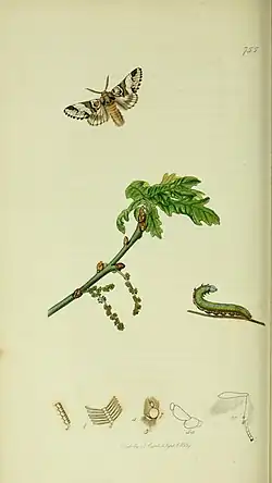 The larvae feed on various deciduous trees, primarily Quercus but also Fagus and Betula.[2] The male, but not the female comes to light. Females are rarely found at all, probably because they stay up in the tree crowns. After mating, the female lays 150 – 200 eggs in small groups on the underside of oak leaves, which hatch after eight to ten days. The newly hatched larvae usually live in small groups, older larvae live singly. They eat the leaves from the tip inwards so that only the middle nerve is left. When the larva is fully grown in August – September, it crawls down on the ground, spinning an oval, earthy cocoon and transforming into a pupa which overwinters. Sometimes the pupa can overwinter twice before hatching.