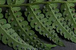 The leaf is a dark blue-green and thick and leathery in texture.[3] It grows 1–2 ft in height and approximately 6 in wide. Each leaf is broken up into leaflets which are arranged on either side of the main stalk. The tips of these leaflets are generally curved toward the tip of the leaf. These leaflets themselves are divided into subleaflets which are blunt-tipped and either serrated or lobed. The fertile leaflets (leaflets bearing sori and spores) are similar to the fertile leaflets in size and appearance.[5] The round sori are located on the margins of the leaf tissue. Before the sori are ripe they start gray then they turn an interesting blue-violet color before finally turning brown when they are mature. The sori are covered in a kidney-shaped indusium which is smooth.[4]