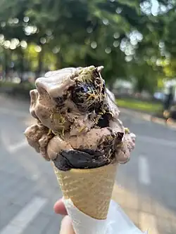 Dubai chocolate (Arabic: شوكولاتة دبي) is a style of chocolate bar filled with kadayif (chopped filo pastry) and a pistachio-tahini cream. It was created in 2021 by Fix Dessert Chocolatier, an Emirati chocolatier in Dubai.[1] Dubai chocolate was popularized in 2024 by influencers on social media, especially those on TikTok, and has since been imitated by vendors worldwide.
