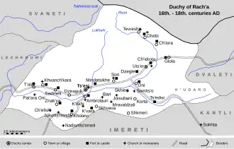 The Duchy of Racha (Georgian: რაჭის საერისთავო, rach'is saerist'avo) was an important fiefdom in medieval and early modern Georgia, located in the western province of Racha, in the upper Rioni Valley in the foothills of the Greater Caucasus crest, and ruled by a succession of eristavi ("dukes") from c. 1050 until being transferred to the royal crown in 1789.