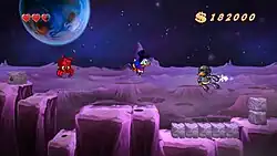 The original game's five levels are featured, all of which have been expanded, and can be played in any order. Each one includes new objectives that must be met to complete the stage, and all of the bosses have new patterns.[8] The game also features a full narrative, explaining the motives and reasoning behind each stage, including how Scrooge is able to breathe on the Moon.[9] Characters briefly featured in the original game, such as Magica De Spell, Flintheart Glomgold and the Beagle Boys play a greater role in the game's plot. The original game's hidden treasures are now found only on higher difficulties, and only one ending is present.