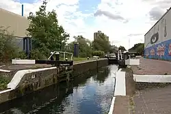 The locks on this canal have been collectively named Old Ford Three Locks,[5] all lying within the district of Old Ford, but are now individually known as Hertford Union Top, Middle and Bottom locks. They are grouped together towards the north-eastern end, and descend approximately 19 feet (5.8 m) from the Regent's Canal to the Lee Navigation. They are all single manual locks, and the largest craft that can use them have a length of 72 feet and a beam of 14 feet.[6]