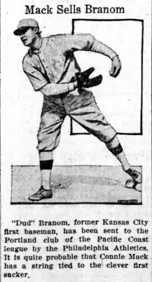 After several seasons with the Blues, Branom was traded to the Philadelphia Athletics in November 1926; the Blues received Bill Wambsganss and $50,000 in return. In 1927, his only major league season, Branom hit only .234 in 30 games played for the Athletics.[3] During that season, his contract was purchased by the Portland Beavers of the Pacific Coast League. He played 102 games for Portland that year. For the next five years, Branom played for the Louisville Colonels of the American Association, hitting between 14 and 17 home runs each season and batting over .300 four times.[1]