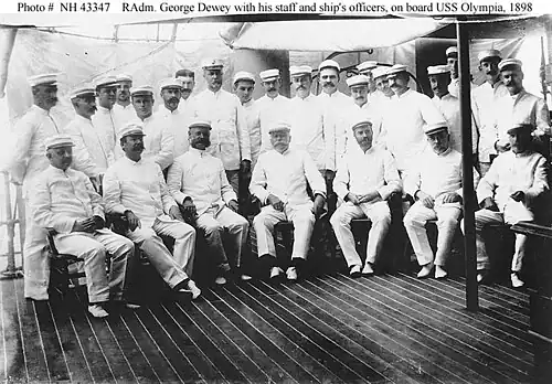 - ^ US Navy (2004). "Photo #: NH 43347 – Rear Admiral George Dewey, Commander of the U.S. Asiatic Squadron, with officers of his flagship, USS Olympia (C-6), and his staff on board the Olympia in Manila Bay circa 20 May-1 June 1898". Naval Historical Center. US Government, U.S. Naval Historical Center Photograph. Archived from the original on September 26, 2012. Retrieved July 23, 2012. Note: Carpenter is standing third from the left.