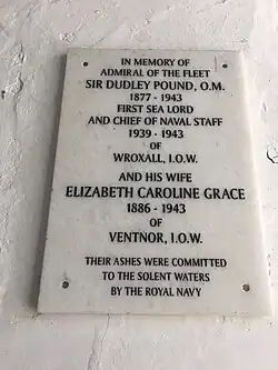 Pound suffered from hip degeneration, which kept him from sleeping, causing him to doze off at meetings.[29] In July 1943 Pound's wife died; by this time it was clear that his health was declining. He had sustained one stroke and the second, during the Quebec Conference the following month, was paralytic, indicative of a fast developing brain tumour.[33] Pound then resigned formally on 20 September 1943.[29] He died from the tumour at the Royal Masonic Hospital in London on 21 October (Trafalgar Day) 1943 and, after a funeral service in Westminster Abbey, followed by cremation at Golders Green Crematorium,[34] his ashes were buried at sea in The Solent.[29]