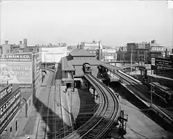 Looking north at the former elevated station's northbound platforms in 1904, with the streetcar loops on each side; an elevated train can be seen in the station, while a streetcar is visible using the right-hand loop and another is using the street-level tracks beneath the left-hand loop.