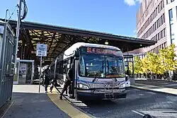 A Silver Line bus at Nubian station in 2024. After plans for light rail, ultimately the Silver Line bus service replaced the Elevated.