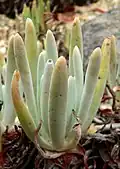 | Caudex 1 to 2.5 cm thick, either branching into clumps of up to 15 rosettes or elongating up to 30 cm. Rosettes are 5 to 15 cm wide, containing 15 to 55 crowded leaves. Leaves are bright green or glaucous. Leaf shape is linear to oblong-oblanceolate, 4 to 7 or rarely up to 17 cm long, 6 to 10 mm wide above when linear but up to 15 mm wide above when oblanceolate, 8 to 15 mm wide at the base and 2 to 4 mm thick. Peduncle 5 to 20 cm tall, 2 to 5 mm thick, inflorescence 2 to 7 cm wide, composed of 2 to 4 ascending branches. Flowers are white with petals 7 to 10 mm long. Chromosomes n = 17, 34.[3][4] | ||||