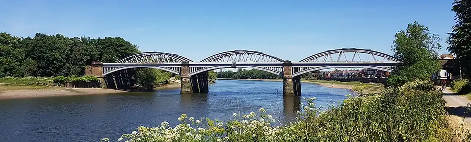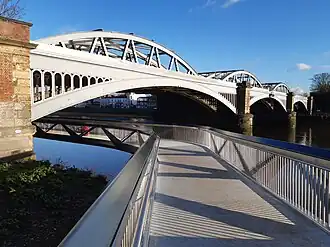The footbridge connects the Thames Path on either side of the railway, allowing the path to follow the river without diversion, and in the words of the London Borough of Hounslow's report Duke's Meadows Regeneration, "removing a frustrating dog-leg along the scenic walking and cycling route."[1] Because Barnes Railway Bridge is a Grade II listed historic structure, it could not be used as a support, so the footbridge was required to have its own independent support structures, with the footway passing below the northern span of the railway bridge. The bridge is to be open to pedestrians and to users of wheelchairs, mobility scooters and pushchairs.[2]