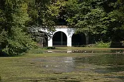 Dunbar Cave State Park is a 110 acre (450,000 m²)[1] protected area in Clarksville, Tennessee. Dunbar Cave is the 280th largest known cave complex in the world, stretching 8.067 miles (13 km) inward. The cave is located in an area of karst topography, including sinkholes, springs, and limestone bedrock. In front of the cave entrance is a large concrete poured structure with three distinct arches and the manmade Swan Lake.[1] In March 2010 the cave was temporarily closed to tours and visitors because a bat infected with White nose syndrome was found in the cave.[2]