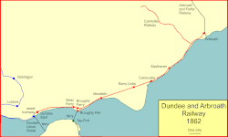 The SNER had obtained an act of Parliament, the Scottish North Eastern Railway (Dundee and Forfar) Act 1864 (27 & 28 Vict. c. clxxii), for a direct line from Dundee to Forfar in 1864, but the work was not put in hand. After the Caledonian Railway took over the Scottish North Eastern Railway, it prepared plans for a different alignment, joining the Arbroath line at Broughty Ferry. The Dundee and Forfar Direct Line opened in 1871. It diverged from the D&A line at Broughty Ferry, leaving towards the south and climbing before turning north and crossing the main line, running through hilly and sparsely populated terrain to Forfar.[4]