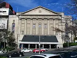 Nevertheless, the then city architect Bill Hesson (1929–2007) conceived a plan to redevelop the whole complex.[22] The Concert Chamber was substantially modified and its seating capacity reduced to become the Glenroy Auditorium by a design of Hesson's when it was made part of a conference centre, the "Dunedin Centre", in 1985-88. The main auditorium was refurbished, but not substantially changed, and a new entrance was added at the foot of the Moray Place facade in 1988-1990.[23] This entrance was designed by Tim Heath.