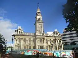 In 1939, the interior of Lawson’s building was remodelled. Lifts were installed and the exterior steps were removed and replaced with a balcony.[18] Some time before 1955, two storeys were added to the southeast corner of the 1930 extension.[19] In 1963, the top of the Municipal Chambers' tower was removed and replaced with a truncated aluminium cap, known as "the meat safe"[20] ostensibly for reasons of safety, but in fact as a prelude to demolishing the whole of Lawson’s structure.[21] This was controversial but plans to demolish the building continued to be entertained into the 1980s.
