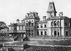 However, in the 1850s the farmhouse and lands were purchased by Henry Reed who was the driving force behind the park as it stands today. Mr Reed demolished the house that stood on the grounds and built his own mansion, completed in 1862, which he named Dunorlan. In a sale brochure of 1871/2 the mansion was described as "a most elegant and substantial mansion, erected ... entirely of Normandy stone, in the Italian style of architecture, finished throughout in the most perfect manner, and in every way adapted for the comfort and enjoyment of a nobleman or gentleman of fortune".[3] However, Mr Reed was "not at all satisfied with the house"[4] on its completion and during its construction "he was not at all satisfied with the plan. The architect, however, said that his reputation was at stake and he would not have anything altered".[4] As his family grew, he decided to pull down part of the building and erect a new wing. The 1881 Census (the house at this point now belonging to the Collins family) shows the house to have operated with 11 servants,[5] a testament to its size.