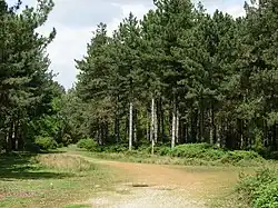 Dunwich Forest is an area of forest and lowland heath around 1 mile (1.6 km) north-west of the village of Dunwich in the English county of Suffolk. The forest covers an area of approximately 9 square kilometres (900 ha; 3.5 sq mi) and was originally planted by the Forestry Commission. The forest is within the Suffolk Coast and Heaths Area of Outstanding Natural Beauty and is in the area known as the Suffolk Sandlings. South of the reserve is the National Trust property of Dunwich Heath, one of the largest remaining areas of lowland heath on the Suffolk coast, and the RSPB reserve at Minsmere. To the north and east of the forest are Dingle Marshes, part of the Suffolk Coast National Nature Reserve.