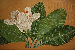 The main artwork in the station consists of murals designed by James Sutherland, entitled Spadina Summer Under All Seasons.[10] Using thousands of pieces of glass, colourful mosaics of flowers were created directly within the station's tiling. Two large mosaics of a giant flower in cross-section face each other across the tracks, reaching upward to a mezzanine level lined with smaller flower mosaics. Sculptor Ron Baird designed massive circular interlocking doors which provide access to the electrical substation, which is nestled behind the northwest entrance.[11]