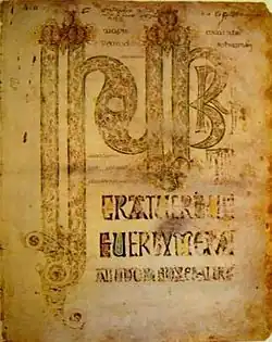 The Durham Gospels is a very incomplete late 7th-century insular Gospel Book, now kept in the Durham Cathedral Dean and Chapter Library (MS A.II.17). A single folio of this manuscript is now in Magdalene College, Cambridge (Pepysian MS 2981). Only two of the fully decorated pages survive: a Crucifixion (the oldest in English art) and the initial to John, and both of these are in poor condition. There were probably originally evangelist portraits and carpet pages, as in other Insular Gospel books conceived on a similar scale. The book was produced at Lindisfarne and brought to Durham when the monks of Lindisfarne removed to Durham because of Viking attacks. The Durham Gospels were written by the same scribe who wrote the Echternach Gospels, now in Paris.