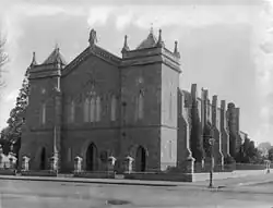 An architectural competition was held for a new church in Durham Street. The winning architectural firm, Crouch and Wilson from Melbourne, had entered a design in the Gothic Revival style in the 1863 competition. Local architect Samuel Farr, who had come to Akaroa in early 1850, came second in the competition and was engaged for the construction supervision.[2][4] In early 1864, the foundation stone was laid by Samuel Bealey who at the time was Superintendent of Canterbury Province.[5] The building was officially opened on Christmas Day 1864 and Canterbury thus had its first church built of permanent materials.[2][6] The stone used includes Halswell and Port Hills basalt and Charteris Bay sandstone.[3] A gallery was added to the building in 1869 and a schoolroom was built next to it in 1875. A parsonage was subsequently erected facing Chester Street.[2] In 1951 a Memorial Chapel was added, dedicated to those killed in both World Wars.[3]