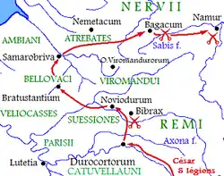 At the time of Caesar's invasion of Gaul, the territory of the Remi stretched from the Seine to the Marne and the Meuse[8] in northeastern Gaul, on the southern border of Gallia Belgica. On seeing the advance of the armies of Julius Caesar, the Belgae united to push back the invasion. The Remi, however, stayed out of this coalition and decided to ally themselves with the Romans. They sent two representatives with offerings to negotiate, and tried in vain to convince the Suessiones, a kin tribe with whom they shared laws and government, to follow them.[9]