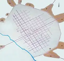 Before the foundation of Durocorteron, the main settlement of the Remi was an oppidum located near the current villages of Variscourt and Condé-sur-Suippe close to Reims.[5] Founded between 450 and 200 BC during the La Tène I and II period,[6] it already covered some 500 Hectares, and was most likely surrounded by two concentric walls or ditches. As shown by archeological finds in the necropolises found at the site, it was then succeeded by the oppidum of Durocortoron (latinised to Durocortorum) at the location of the city Reims.