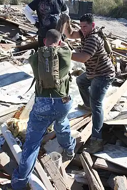 Lance Cpl. Brandon McCulley works with a fellow Marine to help clear away the wooden planks throughout the dump site. The Marines and sailors were teamed up with a handful of civilians to help clear away the debris from Duroville on January 31, 2009.