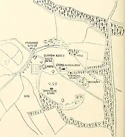 Iona was established in exile and during that time Colum Cille yearned for monasteries in Ireland. The poem 'An Exile's Dream' specifically indicates Durrow as location for a monastery. Durrow was then part of the territory of Tethba, which now lies mostly in County Longford. It was also located near one of Ireland's five ancient routes, Slighe Mór. However, no accounts survive of what Colum Cille's monastery was like at its foundation. The monastic enclosure of Durrow can be seen in the aerial photographs of the surrounding lands. South of the monastery is evidence of Early Christian burials, unearthed by excavation of burial mounds by the National Museum of Ireland.[2] Bede mentions that many more monasteries sprang from Durrow. [3]