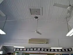The open-air annexe was relocated to its present site, and re-oriented to face north, in time for the commencement of the 1935 school year. A drawing shows the building contained three classroom separated by folding partitions with doors, verandahs on three sides and hat rooms at the ends of verandahs. The side verandahs (east and west) were additions. Along the north verandah wall, doors were relocated into new openings, and a double hung window with fanlight was added. A new, VJ timber-lined ceiling replaced the pressed metal one. Stairs were centrally located from the verandah.[45][46] Toilets were added to the understorey in 1936.[45][1]