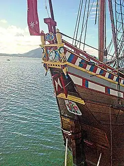 Duyfken (Dutch pronunciation: [ˈdœyfkə(n)]; lit. 'Little Dove'), also in the form Duifje or spelled Duifken or Duijfken, was a small ship built in the Dutch Republic. She was a fast, lightly armed ship probably intended for shallow water, small valuable cargoes, bringing messages, sending provisions, or privateering.[1] The tonnage of Duyfken has been given as 25–30 lasten (49–59 tonnes or 108–130 thousand pounds).[2]: 14