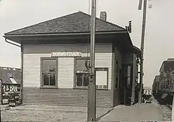 The Dwight Farm in North Belchertown was about 400 acres at this time. Harrison Dwight donated land upon which he erected the train station (built about 1857) and the water tower for the locomotives. He developed the adjacent sawmill on the Scarborough Brook, an ostensible monopoly on supplying wood to the railroad. He also, like many in Town, made carriages. The village, up to that point known as Logtown, afterward became known as Dwight's Station in his honor and of the noted family (his second cousin was Timothy Dwight IV). Dwight Chapel took the name as well. The tradition of local mills in Dwight supplying timbers for shipbuilding continued, an industry enhanced by the railroad.[65]