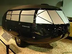 The Dymaxion car was designed by American inventor Buckminster Fuller during the Great Depression and featured prominently at Chicago's 1933/1934 World's Fair.[1] Fuller built three experimental prototypes with naval architect Starling Burgess – using donated money as well as a family inheritance[2][3] – to explore not an automobile per se, but the 'ground-taxiing phase' of a vehicle that might one day be designed to fly, land and drive – an "Omni-Medium Transport".[4] Fuller associated the word Dymaxion with much of his work, a portmanteau of the words dynamic, maximum, and tension,[5] to summarize his goal to do more with less.[6]