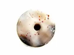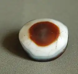 Another similar type of bead is called Luk Mik ("goat's eye") – it is a naturally formed "one-eyed" coin-shaped[5] agate (pictured). Luk Mik are the preferred dzi for travelling in Tibet.