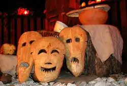 Within the framework of grandfather's rituals, the souls coming to "this world" had to be hosted in order to secure their favour and at the same time help them to achieve peace in the hereafter. The basic ritual form was feeding and watering of souls (e.g. honey, groats, eggs, forge and vodka) during special feasts prepared in houses or cemeteries (directly on graves). A characteristic feature of these feasts was that the people who ate them dropped or poured some of their food and drinks on the table, floor or grave for the souls of the deceased.[5] In some areas, however, the ancestors also had to be given the opportunity to bathe (a sauna was prepared for this) and warm up.[6] This last condition was fulfilled by lighting fires, whose function is sometimes explained differently. They were supposed to light the way for wandering souls so that they would not get lost and could spend the night with their loved ones. The remnants of this custom are contemporary candles lit on graves.[6] However, fire – especially the one kindled on crossroads – could also have had another meaning. The idea was to prevent demons (souls of people who died suddenly, suicides, drowning, etc.) from being born, which were believed to have been extremely active during this period.[6] In some regions of Poland, e.g. Podhale, in the place of someone's violent death, every passer-by was obliged to throw a sprig at the stake, which was then burned every year.