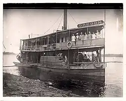 At the same time as the Moons accepted the call to serve, a plea went out for funds to purchase a boat to provide transportation for the missionaries on the Congo River. Prior to that, the missionaries had used dugout canoes. The Oregon churches took up this call and raised the funds for the boat, which was built by Tom Rees and Sons, shipbuilders in Pittsburgh, Pennsylvania. It was assembled and dedicated in October 1909 at the centennial celebration of the Disciples of Christ Church. It was then taken apart and transported in 1,200 different packages by ship and narrow-gauge railway to Kinshasa, on Stanley Pool, in Africa where the British Baptist Mission Society had a station. E. R. Moon had training as a carpenter and, along with Robert Wilson, assembled the S. S. Oregon from June to October 1910. It was a wood-burning, shallow-draft sternwheel river steamer that was 90 feet (27 m) long and had an 18-foot (5.5 m) beam. It had a steel hull that contained about 20,000 rivets. It had a main deck and one upper deck.[5] The native name for the steamship was Nsang'ea ndoci, which means "Good News", appropriate for a missionary undertaking.
