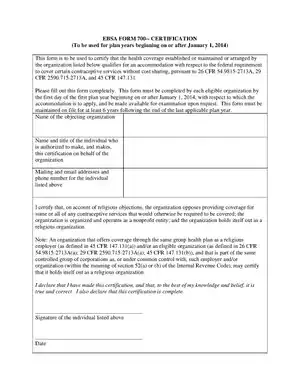EBSA Form 700 is a form that the United States Government had required certain non-profit organizations to complete and submit, beginning January 1, 2014, in order to claim an exemption from the contraceptive mandate under the Affordable Care Act. After the U.S. Supreme court issued temporary injunctions, preventing any penalty against some non-profit institutions who objected to filing the form, the U.S. Department of Labor issued a new version of the form making it clear that organizations can, instead object by a letter.[1]