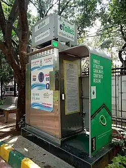 An electronic toilet or eToilet is a type of public toilet that is used in India. The increase in the use of eToilets is in support of Swachh Bharat Abhiyan (in English, the Clean India Mission) which intends to reduce the practice of open defecation.[1]