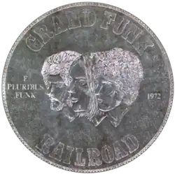 E Pluribus Funk is the fifth studio album by American rock band Grand Funk Railroad. The album was released on November 15, 1971, by Capitol Records. Like previous Grand Funk Railroad albums, it was recorded at Cleveland Recording Company and is the final album produced by Terry Knight. The title is a play on the Latin motto of the United States of America, E pluribus unum ("Out of many, one") and translates as "Out of many, Funk". The original release cover (designed by Ernie Cefalu) was completely round and covered with a silver-like film to resemble a large coin. The back side of the cover of this album included a die cast picture of Shea Stadium to celebrate Grand Funk beating The Beatles' Shea Stadium attendance record by selling out in just 72 hours.