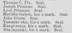 Though Eagle Woman opposed the founding of the reservation and did not sign the 1876 treaty, she signed an 1882 treaty which reserved land for schools, modified reservation boundaries, and changed the government workers and rations they received.[19] Her assent was recorded at the Standing Rock Agency, November 30, 1882, "Matilda Galpin, her x mark. Seal" as the only woman to sign among the chiefs and headmen of the Sioux, making her the first woman to sign a treaty with the United States.[4][o][7]: 21