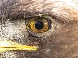 Eagles have upper and lower eyelids, the bottom lid is more mobile and gives the appearance of the eyelid blinking from bottom to top. Inside the eyelids are made up of connective tissue called fibroelastic plate (tarsus) that function to support the outer eyelid and give it shape. On the eyelids are small hair like feathers called filo-plumes that are comparable to human eyelashes. Eagles have a third eyelid also known as a nictitating membrane,[11] which "grows in the inner corner of the eye, next to the tear duct". Eagle tears "produced by the lacrimal gland and Hardarian gland" moisten the eyes and contain the chemical lysozyme which protects against salt water and also destroys bacteria, thus preventing eye infections. The nictitating membrane is a thin semi-transparent piece of skin that acts a sweeping wiper moving laterally across the eye [2] controlled by the quadratus muscle. The third eyelid also acts as a mechanism to remove "dust and dirt from the cornea".[12] The eagle iris is a pale yellow color, much lighter than human eyes. Both eagles and humans have a white area called the sclera, but in the case of eagles, it is hidden below the eyelid. Eyelid openings are oval-shaped in humans, while they are round in the case of birds' eyes.[2]