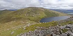 Loch Leamhain (Gaelic: Loch a’Bhealaich Leamhain) is a glacial corrie tarn, in the high mountains to the East of Loch Earba, at an elevation of 635 AOD. The corrie drains towards the southeast. Damming the entrance would create the upper reservoir, raising the level of Loch Leamhain by around 75m to 710m AOD. When full, the reservoir would be around 1.5km long by 1km across. [7]