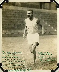 Robert Earle "Earl" Johnson (March 10, 1891 in Woodstock, Virginia – November 19, 1965) was an American athlete who competed mainly in the cross country team. He was the 1921 National Champion.[1] He effectively defended his championship in 1922 as he was beaten by Ville Ritola's Van Cortlandt Park course record, but since Ritola was Finnish, Johnson was the first American finisher in the National Championships. A rare black athlete of his day, he worked for the Edgar Thomson Steel Works in Pittsburgh, Pennsylvania.[2]