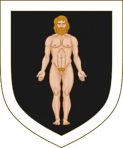 The Earl's coat of arms is sable, a man's body proper, i.e. the flesh-coloured silhouette of a man against a black background. The origin of this peculiar arms was written about by Sir Robert Douglas, 6th Baronet, in 1764: